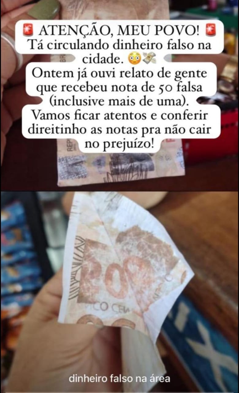 De acordo com a publicação feita pelo comerciante, as notas em questão seriam de R$ 50. Ele advertiu: “Atenção, meu povo, dinheiro falso está circulando na cidade.“